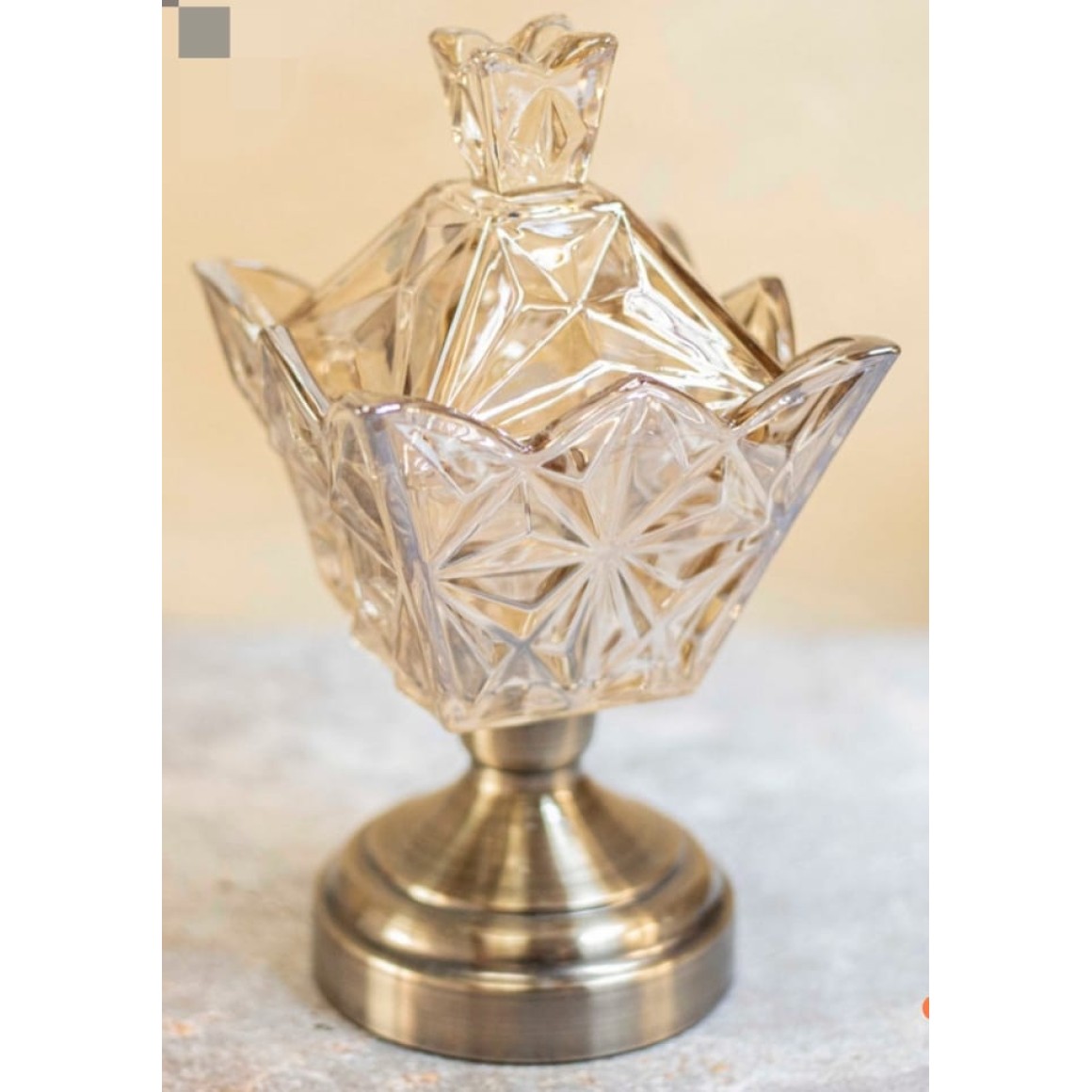 BOMBONIERE AV105 QUADRADA EM VIDRO AMBAR C/ TAMPA A27XL14CM